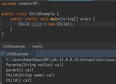 5.Parent 클래스를 상속받아 Child 클래스를 다음과 같이 작성했습니다. ChildExample 클래스를 실행했을 때 호출되는 각 클래스의 생성자의 순서를 생각하면서 출력 결과를 작성해 보세요.