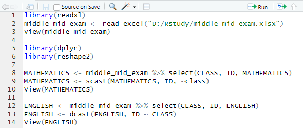 4. 1학년 1반, 2반 3반 학생 5명씩의 중간고사와 기말고사 성적이 기록된 엑셀 파일을 가져온 후 다음 실행 결과와 같이 반별 수학 점수와 영어 점수를 각각 출력해 보세요.